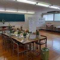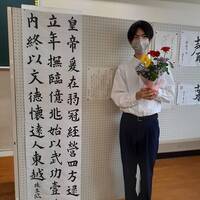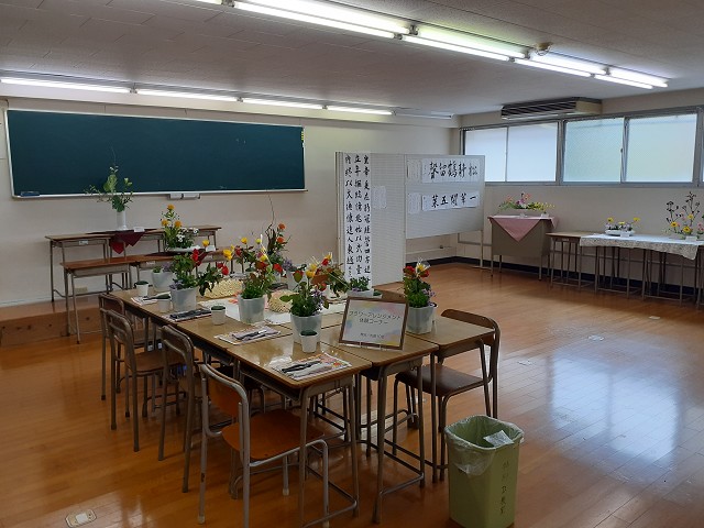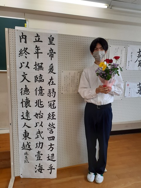 1年生小森君による書と本校職員の森淳子先生が所属するいけばな小倉流の皆様の生け花の展示がありました。