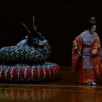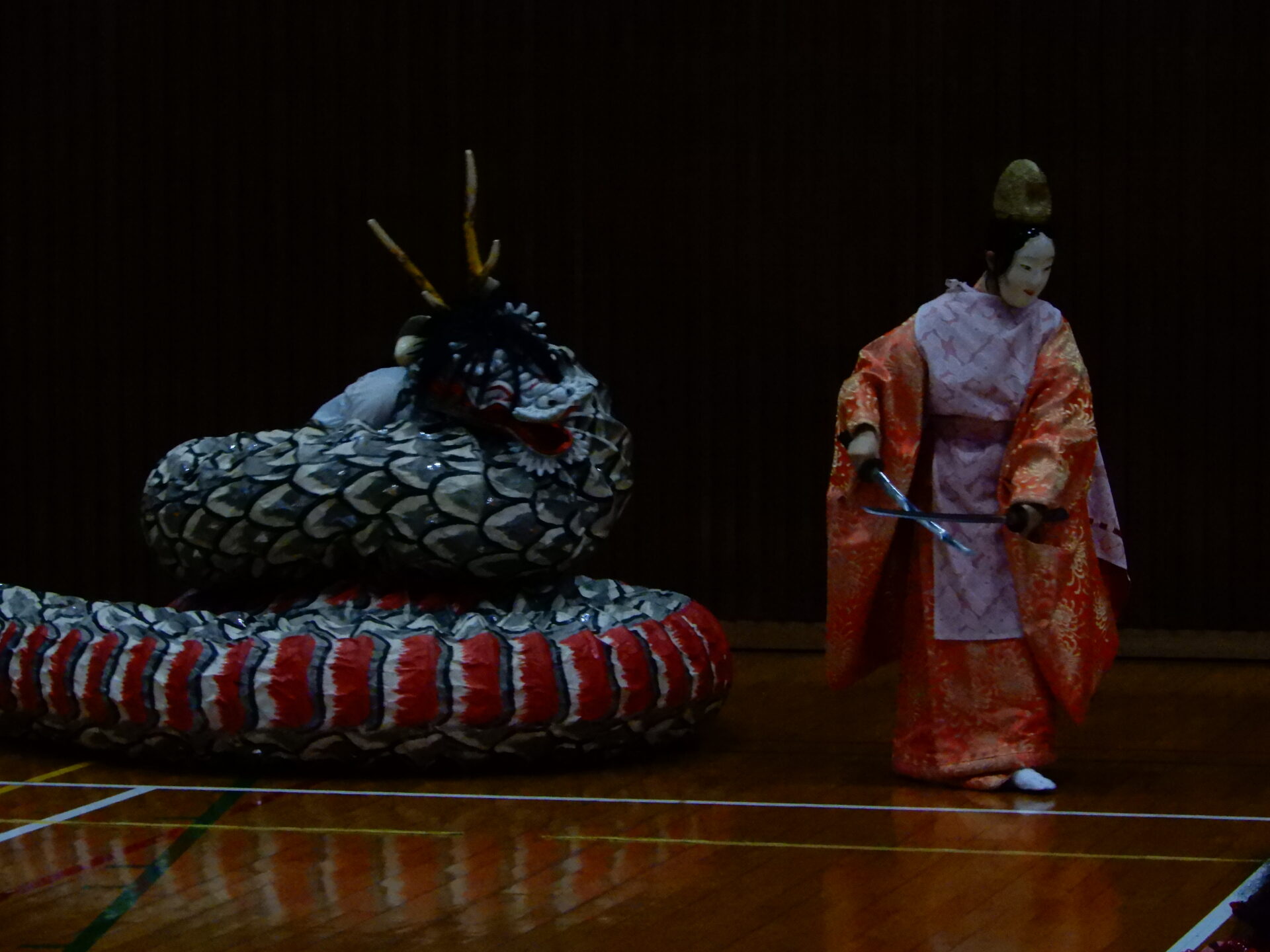 高島に大蛇(オロチ)が住み着いている噂を聞き付けた武士が、退治をするために大蛇に挑んだ伝説「蛇谷」を演じる「姫大蛇」。