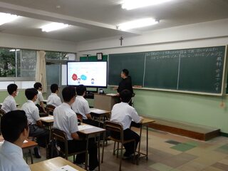 本校の生徒が校内を案内し、3年生の英語の「習熟度別授業」をご覧いただいた後は、体験授業です。