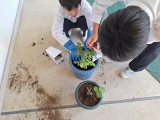 もちろん初めてですが、慎重に作業を進め、無事2鉢を大きな鉢に植え替えました。